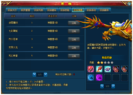 4、每只boss每天最多只能被召唤及击杀一次,次日凌晨将会刷新宗族boss的召唤次数。