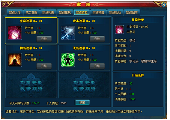 2、学习宗族技能需要升级宗族建筑-奇术堂,奇术堂等级越高,可学习的技能等级越高;