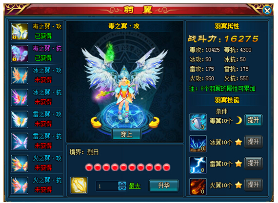 d. 羽翼境界:显示在羽翼界面下方,分为四个境界:繁星、皓月、紫阳、烈日。初始境界为繁星,等级越高属性越好;
