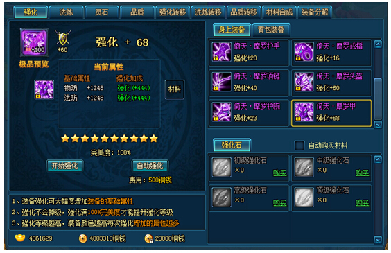 温馨提示:强化失败不会掉级,同一等级可多次强化,强化达到10星则强化等级提升