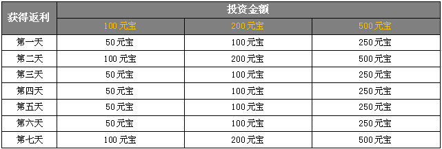 活动内容:活动期间内,玩家只要花费元宝购买相应的投资,即可在7天内获得相应的收益,累计返利450%