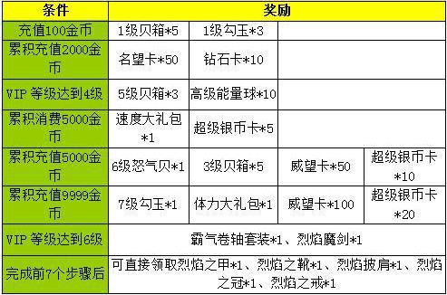 【活动介绍】:玩家按照顺序满足活动要求,即可领取对应的奖励。(无法跳过步骤参与活动,所有充值需要在活动期间内完成)
