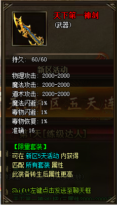 活动内容:逐日传说新篇章,开服首日冲级速度大比拼,只要在开服首日结束时等级达到全服第一,就能立刻获得逆天武器——天下第一神剑!