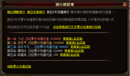 新区5天内累计充值排行前5名可在第6天领取超级丰厚奖励。可在九龙城npc“排行榜管理”处查看。