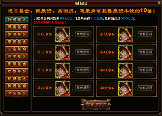 1、升级基金:需要2888元宝,总共获得34亿经验,总价值超过34000元宝。