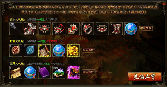 2、财神大礼包:需要1800元宝,每天可领取1次。超级气血丹*2、超级魔幻丹*2、1000万经验劵*5、1级等级仙丹*1、2000万绑定金币;