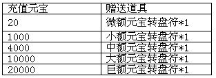 活动期间,玩家充值至指定额度,即可获得对应的元宝转盘符,使用元宝转盘符转动转盘,将可随机获得转盘上任意额度的元宝奖励。每个额度转盘只能转一次,每一轮转完之后将开启下一轮转盘。元宝转盘升级后,最高可累计获得30520非绑定元宝返利哦!
