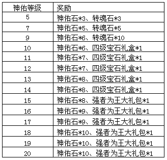 活动规则:活动期间,将任意装备神佑提升到指定等级,可获得额外系统赠礼。