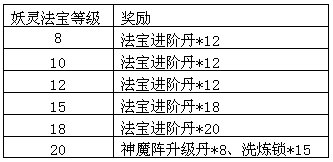 活动规则:活动期间,将灵戒洞天里任意妖灵法宝等级提升到指定等级,可获得额外系统赠礼。