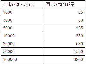 活动期间,玩家充值至指定额度,即可获得对应的元宝转盘符,使用元宝转盘符转动转盘,将可随机获得转盘上任意额度的元宝奖励。每个额度转盘只能转一次,每一轮转完之后将开启下一轮转盘。元宝转盘升级后,最高可累计获得30520非绑定元宝返利哦!