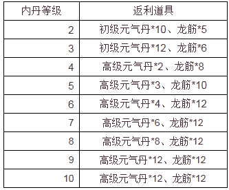 活动规则:活动期间,在刷新内丹重铸系统每消费800元宝即可获得高级元气丹*3奖励!