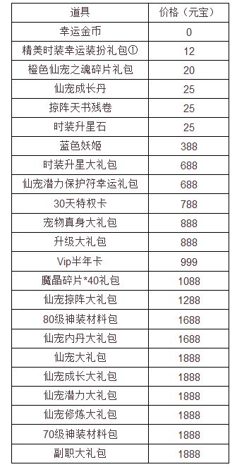 洗炼锁*120、八门保护符*80、护神丹*100、五级宝石礼盒*10、妖魂紫*80、时装升星石*150 |